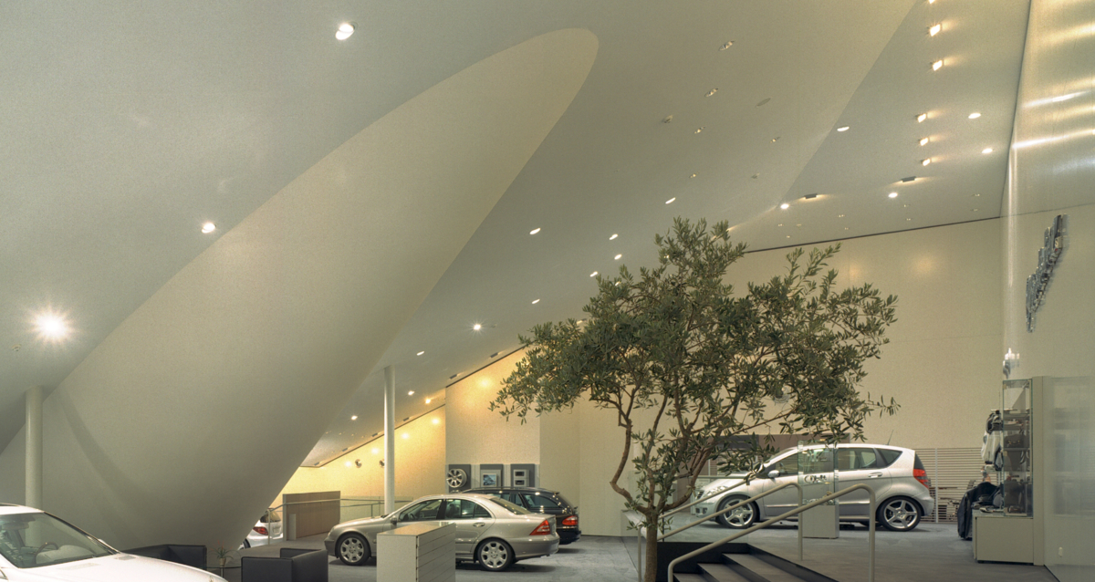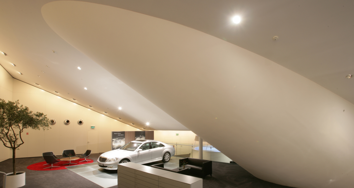 1.014 Ausstellern aus 44 Ländern, rund 940.000 Besuchern - so die beeindruckenden Zahlen der 61. IAA. Ein Highlight war die Premiere der neuen S-Klasse. Mercedes-Benz präsentiert sich seit 1991 in der Frankfurter Festhalle. Deren eindrucksvolles Kuppeldach galt es, in das Standkonzept zu integrieren, die Besucherränge behutsam einzupacken und jedes Mal spektakulär neu zu inszenieren. So wartete Mercedes mit außergewöhnlichen, facettenreichen Decken- und Wandgestaltungen in kürzester Zeit - für kurze Zeit auf. Die Lösung: Moderner Trockenbau mit Gipsplatten und besonders biegsame LaCurve-Platten.
