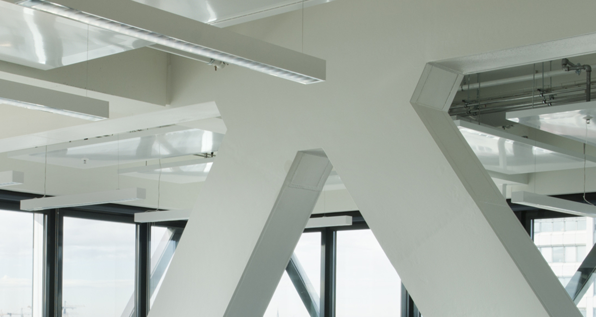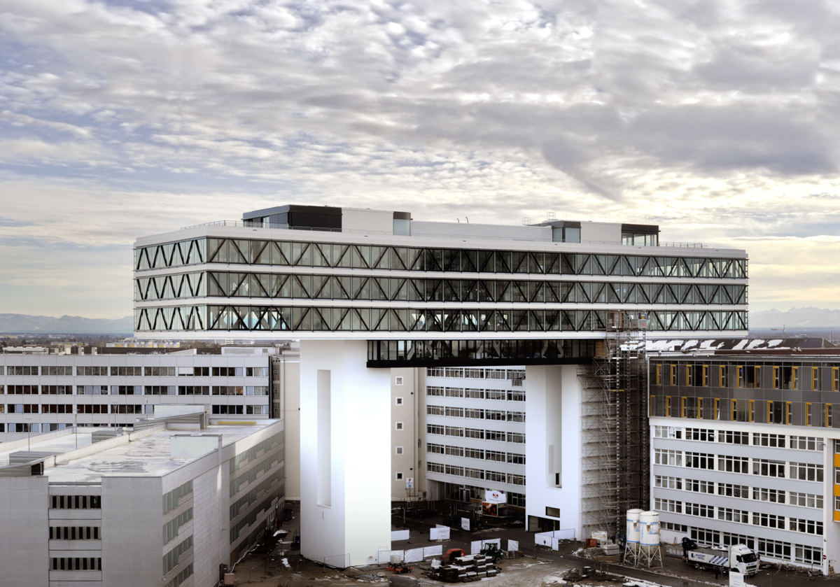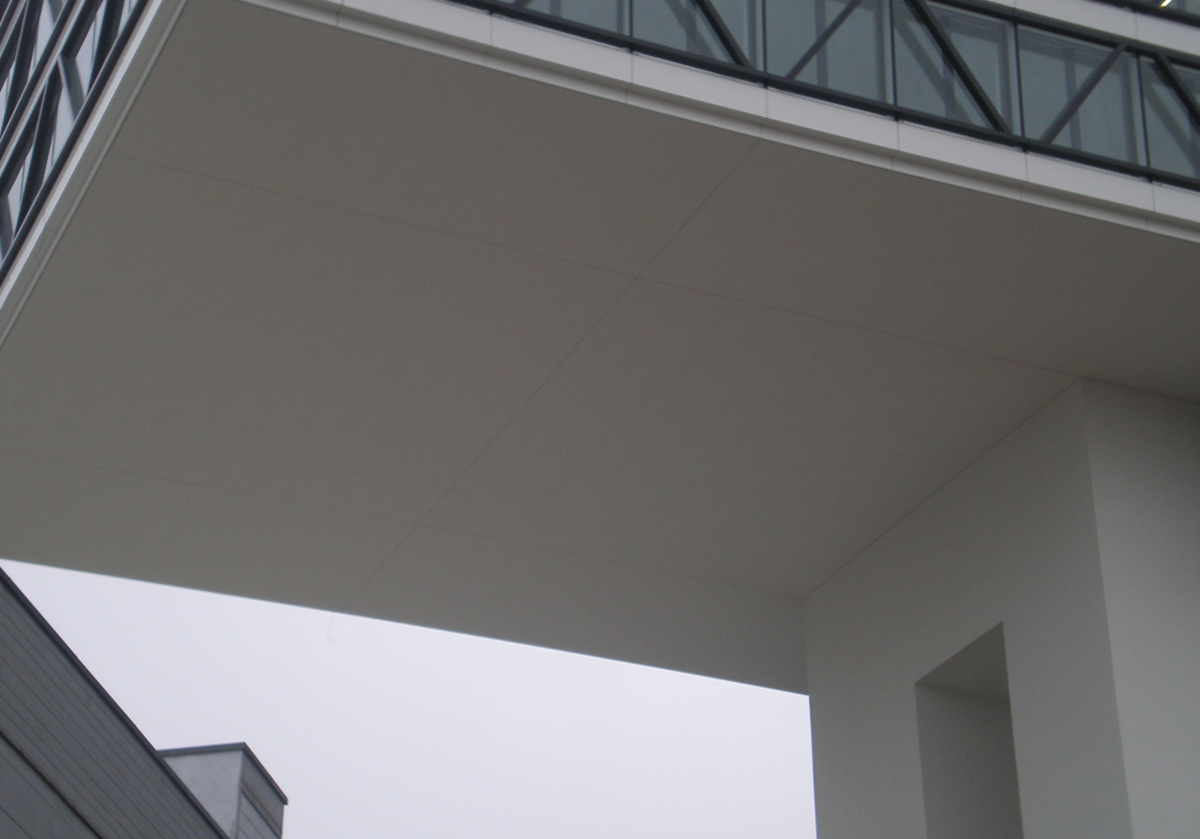 Der Gewerbepark „Media Works“ am Münchner Ostbahnhof ist seit den 1940er Jahren Standort zahlreicher Medien- und Modeunternehmen. Mit der Medienbrücke, einem dreigeschossig schwebendem Büroriegel auf zwei mächtigen Türmen, ergänzte das Büro Steidle Architekten das Areal spektakulär. Für die Deckenuntersicht des 90 Meter langen schwebenden Riegels wählte das renommierte Büro die zementgebundene Trockenbauplatte Hydropanel von Siniat. In fast 50 Metern Höhe bietet die robuste und feuchtigkeitsunempfindliche Platte Sicherheit insbesondere bei den dort auftretenden Windlasten.