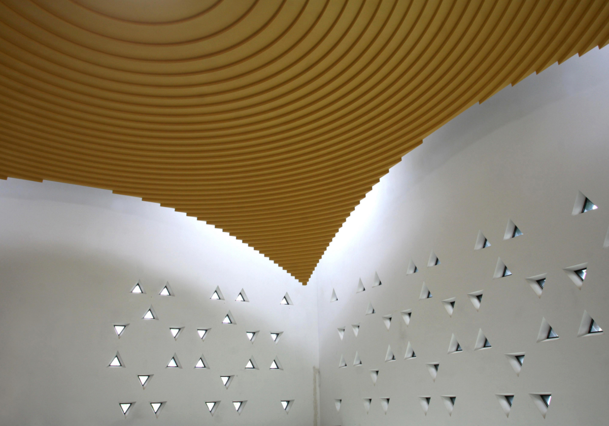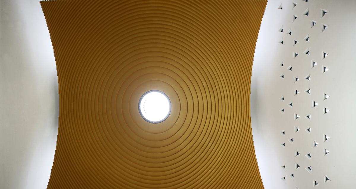 Den von der Stadt Bochum durchgeführten Architektenwettbewerb hat der Kölner Architekt Prof. Peter Schmitz gewonnen. Sein Entwurf für das 4.300 qm große Grundstück überzeugt durch maßvolle Repräsentanz, hohe Funktionalität und gelungene städtebauliche Integration. Um einen Kontrast zu den weichen Formen des benachbarten Planetariums zu schaffen, hat er ein scharfkantiges Profil für den dreigliedrigen Bau gewählt. Der Davidstern als reliefartiges Fassadenornament bildet im Innenraum des Synagogensaals einen umlaufenden Wandfries. Darüber schwebt eine goldgelbe Kuppel, die sich durch eine Lichtfuge von den Wänden absetzt. Ursprünglich war ein Baldachin als oberer Raumabschluss vorgesehen. Die Kuppelform entspringt dem Wunsch der Gemeinde nach Feierlichkeit und Erhabenheit dieses zentralen Raums, in dem vor allem Gottesdienste stattfinden. Realisisert wurde die Kuppel mit glasfaserverstärkten Elementen aus LaArt.