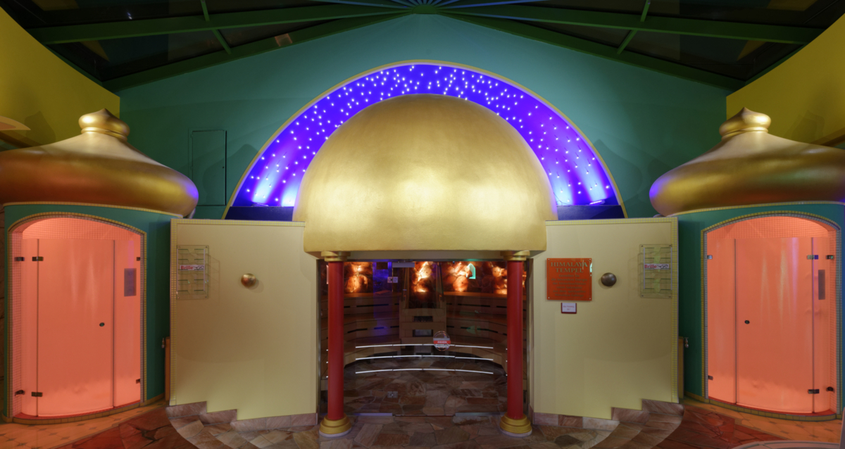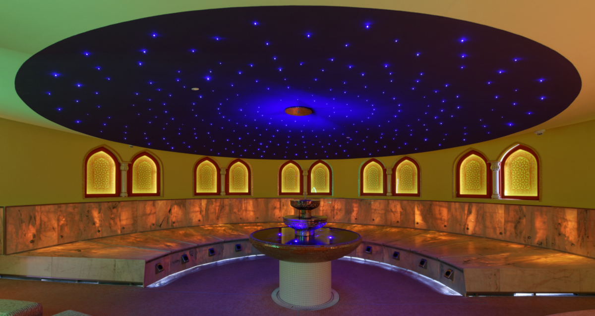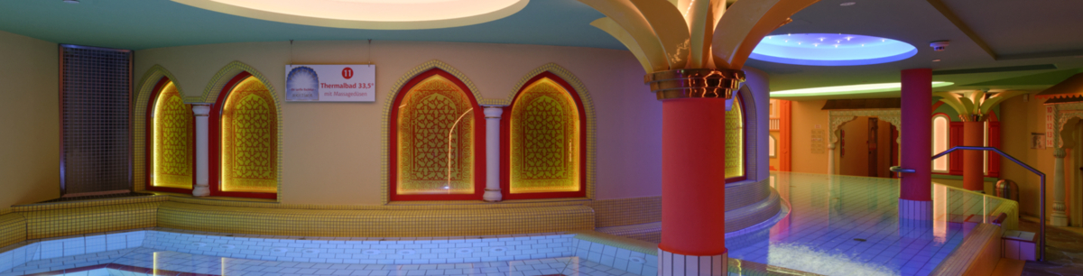 Wasser- und Thermalbecken, Duschtempel, Warmluft-, Heißluft- und Dampfbäder, Salzsteinliegen in der Lichtseehöhle und der heiße Stein im Hamam Centrum. Eine Badekur aus 15 Stationen leitet durch die vielseitige Erholungslandschaft aus Licht, Farben und Formen. Räumlich vermitteln vor allem der große Sternenhimmel sowie die goldenen Kuppeldächer das Gefühl von Morgenland. Palmensäulen und Ornamentfliesen vervollständigen das Bild. Die beeindruckende Formenvielfalt, aber auch die großen Differenzen von Temperatur und Luftfeuchte in den einzelnen Badbereichen stellten hohe Anforderungen an die eingesetzten Materialien und machten einen Ausbau mit speziellen Trockenbau-Lösungen erforderlich.